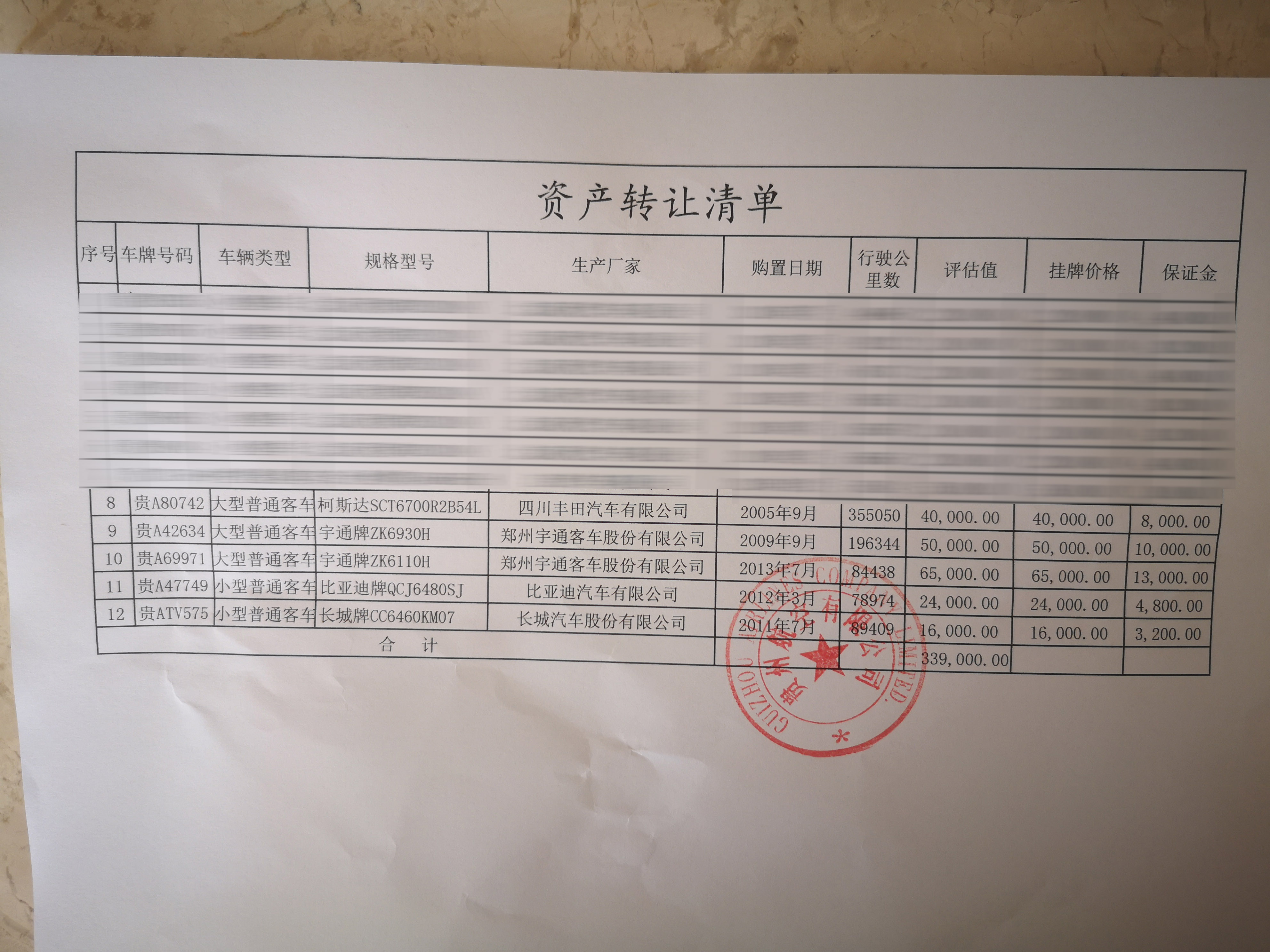 | 重要信息披露 | 1、意向受讓方須自行了解本次轉(zhuǎn)讓標(biāo)的的全部現(xiàn)狀及瑕疵,本次轉(zhuǎn)讓標(biāo)的以現(xiàn)狀轉(zhuǎn)讓; 2、本次轉(zhuǎn)讓車輛共5臺,可單輛受讓,也可多輛受讓; 3、本次轉(zhuǎn)讓的所有車輛由轉(zhuǎn)讓方協(xié)助受讓方辦理過戶手續(xù),過戶產(chǎn)生的所有費用由受讓方承擔(dān); 4、本次轉(zhuǎn)讓的5臺車輛均無違章情況并已全部年審; 5、本次車輛有關(guān)信息詳見《資產(chǎn)評估清單》。 | |||||||