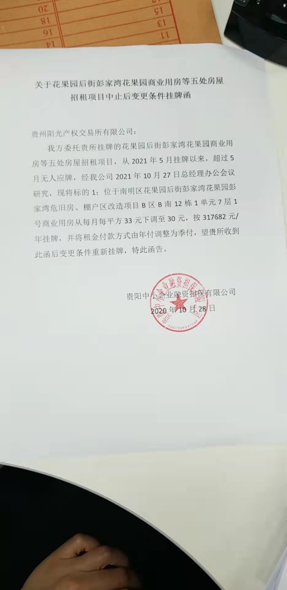 我所受貴陽中小企業(yè)融資擔(dān)保有限公司委托掛牌《花果園后街彭家灣花果園商業(yè)用房等五處房屋招租項目》項目編號GP-C-ZL-2021033(32),因招租方要求需對項目進行條件變更,現(xiàn)將項目進行中止掛牌。